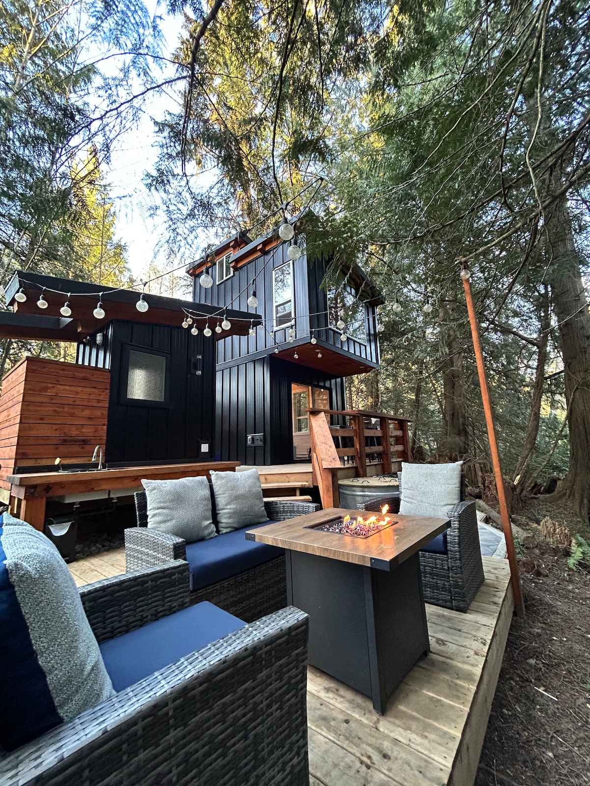 La cabaña TallTrees está ubicada entre árboles imponentes, creada para encajar de forma natural en su entorno. El espacio habitable de concepto abierto está lleno de luz natural, con vistas al bosque desde todas las ventanas y cálidas características de madera en todas partes. El sendero junto a la cabaña conduce a través de un bosque antiguo hasta el río Englishman y las cascadas. Al final del día, disfruta del cielo nocturno desde tu propia bañera de hidromasaje privada, una escapada verdaderamente única.