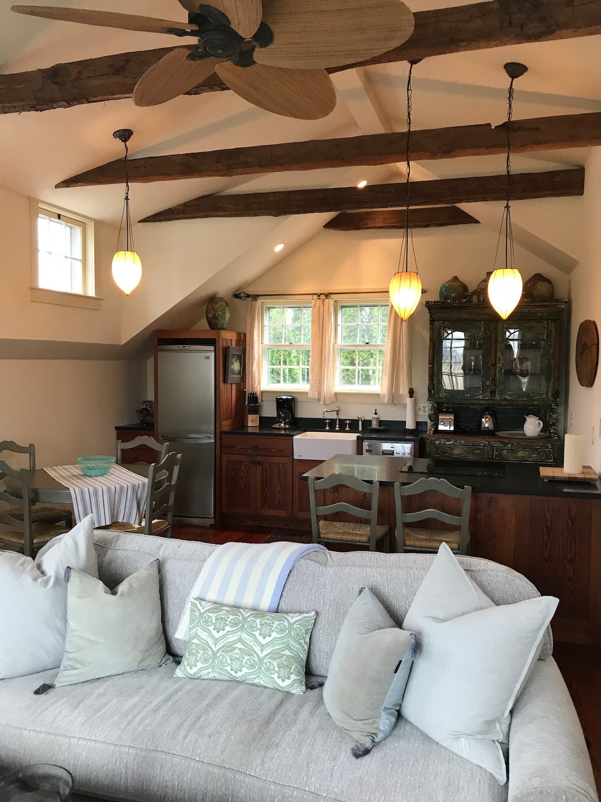A unique upside down two bedroom cottage with a deck and a view of the Harbor. A curated space with antique beams, handcrafted doors, flooring and cabinetry, antiques and fine art. It all lends a vintage feel to an up to date with all the amenities home. There is a private small side yard and garden with outdoor grill and seating. This is not a party house, it’s a sensitive house, I live right on the property, adjacent to the cottage, you have full privacy but no shenanigans.