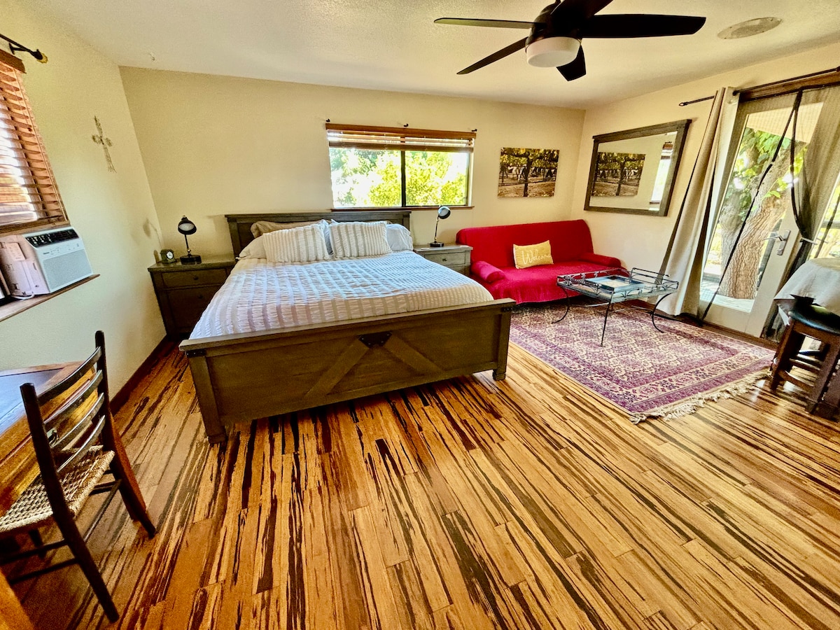 Disfruta de un café en el zen patio cubierto de enredaderas en esta casa de campo aislada en la parte trasera de una propiedad de época en Berkeley. Las sábanas blancas, los muebles artesanales y el revestimiento de madera pintada lo convierten en un refugio sofisticado pero rústico. La habitación principal es acogedora, con una gran claraboya, una cómoda cama tamaño queen, una silla giratoria y un escritorio con silla. Hay una pequeña cocina americana. En el exterior hay un patio de piedra, un banco colgante con vistas a un estanque koi y una pequeña mesa y sillas al aire libre. ZCSTR2021-0842