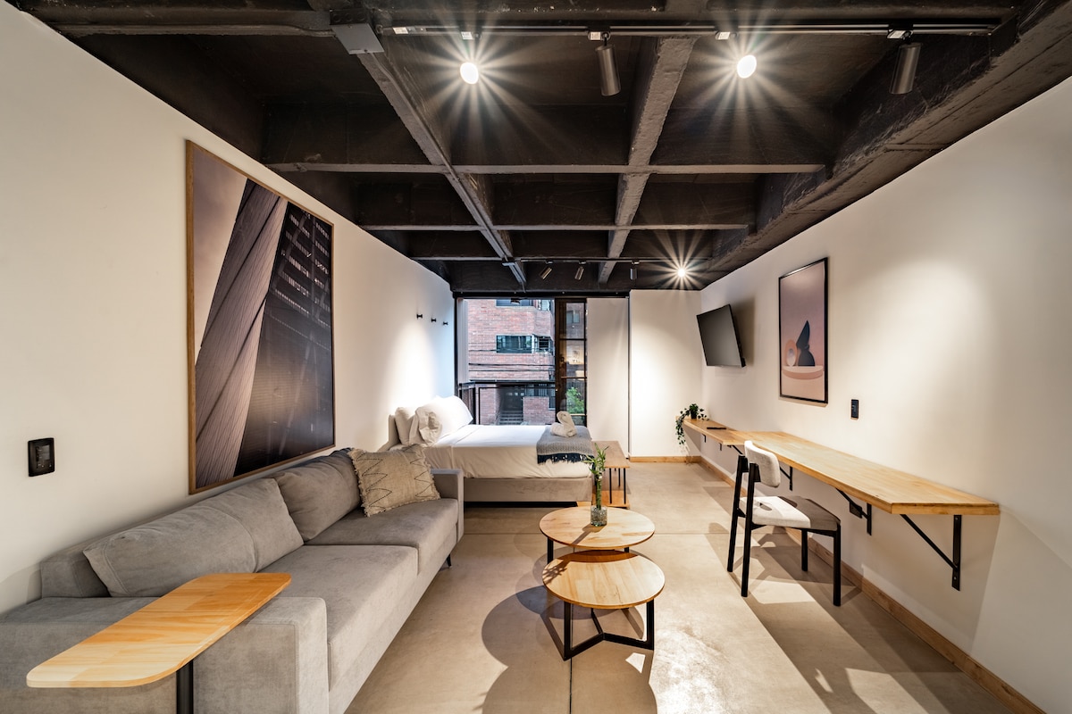 Stylish 1BR apartment in the heart of La 70 and 5 minutes walking to Laureles area. Enjoy a cozy space with a hammock balcony, full kitchen, A/C, fast WiFi, free laundry, and self check-in with digital codes. Work remotely with access to a coworking space inside the building. Steps from top restaurants, cafés, metro, and local life. On-site support staff 24/7. Thoughtfully designed to inspire comfort, creativity, and connection with the city.