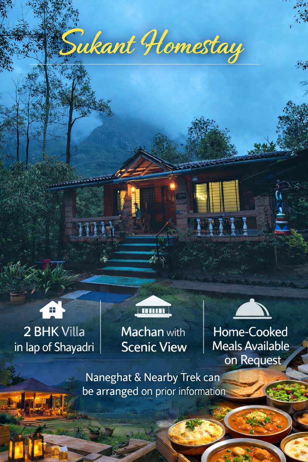 Ashok Vihar Homestay is a serene 2BHK private pool villa nestled in the Sahyadri ranges with stunning mountain views. Surrounded by nature and close to popular trekking points such as Naneghat, it’s perfect for a peaceful getaway. The bungalow is spacious, fully equipped, and ideal for families or groups seeking comfort, privacy, and fresh mountain air—especially magical during monsoons.