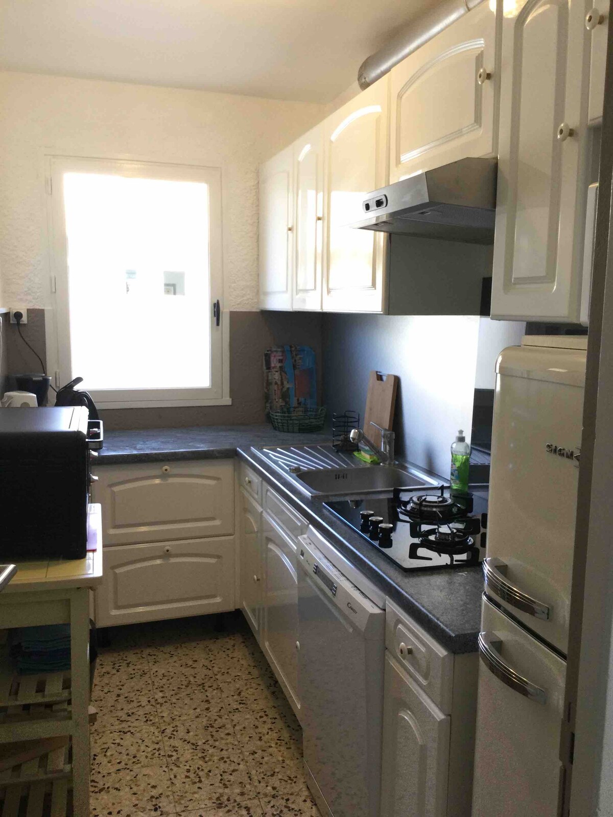 Alojamiento situado en la 1.ª planta de 1 en residencia tranquila con plaza de aparcamiento privada y gran terraza. A 100 m de las tiendas de conveniencia, a 2 minutos de la playa a pie. Equipado con wifi, aire acondicionado, lavadora, nevera con congelador, microondas, TV grande con Chromecast. Dispone de un dormitorio con una cama de matrimonio nueva y muy cómoda, así como un vestidor, un sofá cama en la sala de estar. Con una ubicación ideal y completamente renovado.