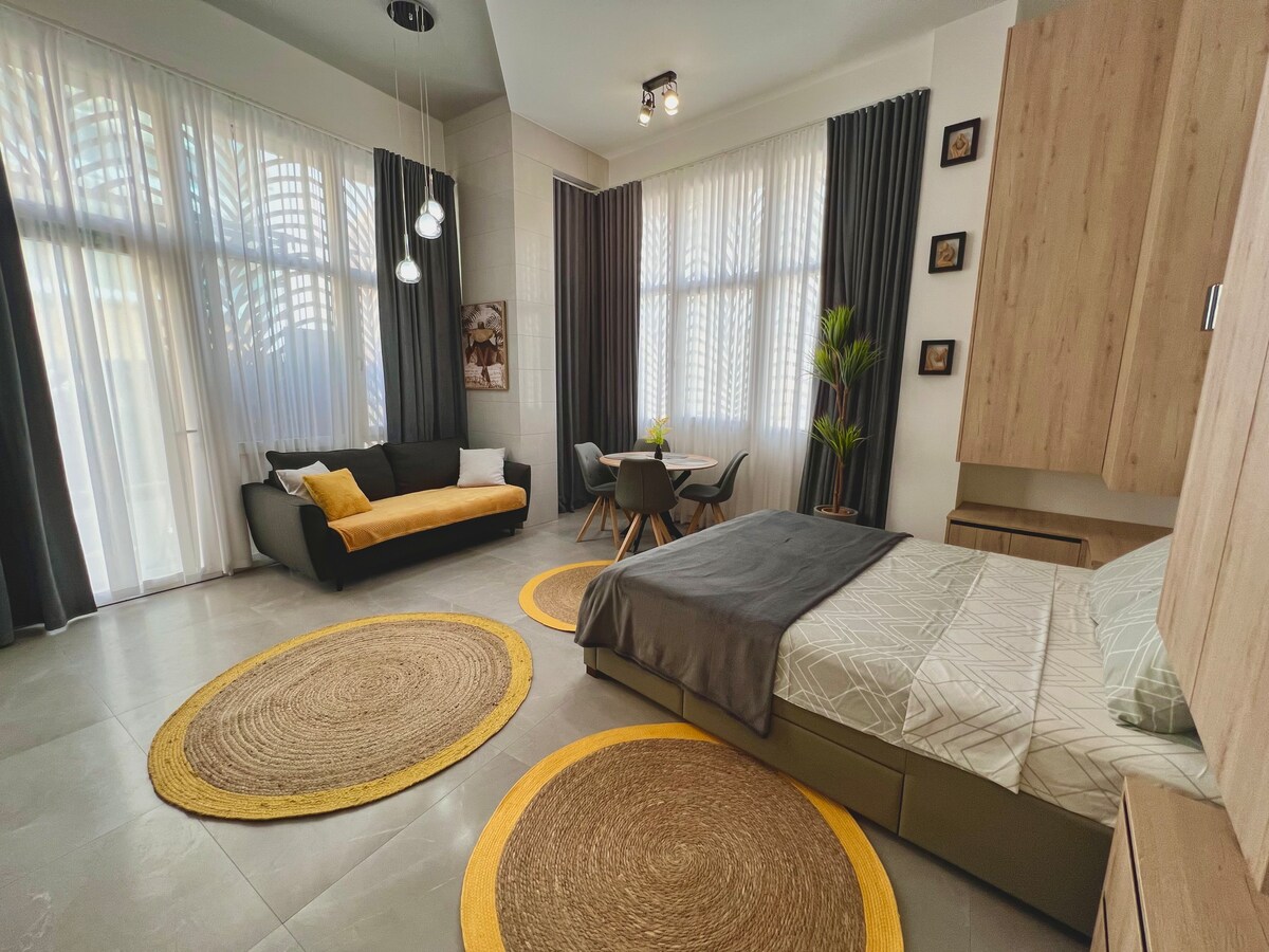 Un loft confortable nuevo con mucha luz natural con dos balcones con buenas vistas al exterior , cuenta con una habitación con una cama de matrimonio y un sofá cama Justo en frente de la cama que también se convierte en cama de matrimonio, climatizado, televisión , calentador, plancha, perchas, electrodomésticos : cafetera, microonda, lavadora, horno , utensilio de cocina; en el cuarto de baño encontraras toallas, gel de ducha, champú, jabón de manos y secador de pelo.