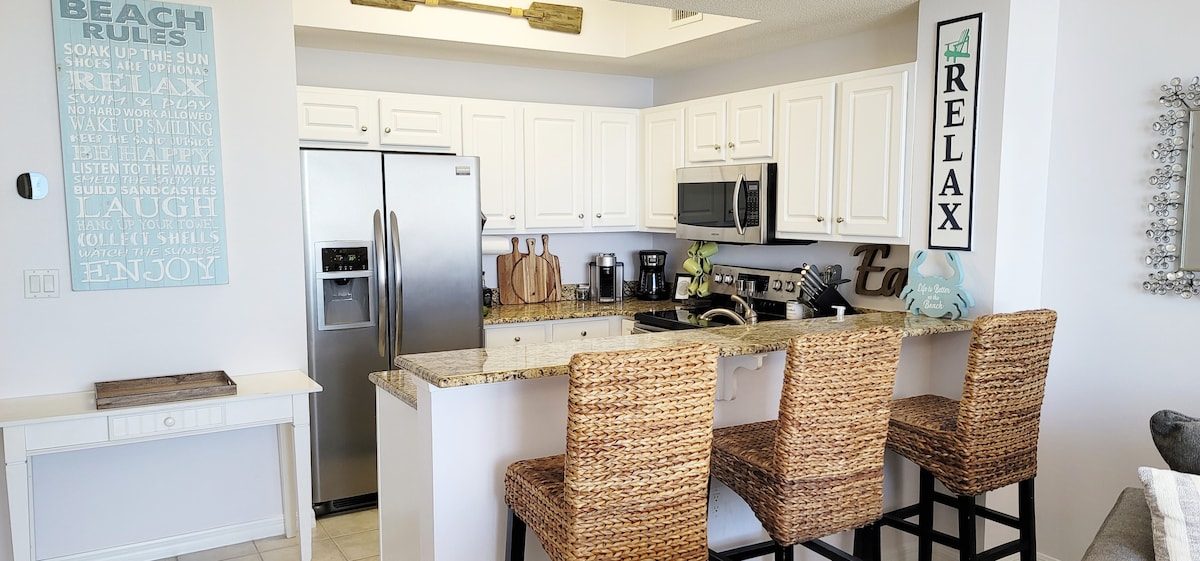 Hermoso apartamento de 1 dormitorio y 1,5 baños con capacidad para 6 personas. ¡Trae tus trajes de baño y prepárate para relajarte! El apartamento está en el piso 12, la torre más cercana al muelle. - 1 dormitorio con cama tamaño king, acogedora zona de literas para niños y colchón de espuma de gel en el sofá plegable. (TODOS LOS COLCHONES SERÁN NUEVOS EN SEPTIEMBRE DE 2025). - ¡Se proporcionan sábanas y toallas, incluidas toallas de playa! - 2 sillas de playa, 2 tablas de boogie y una sombrilla incluida. - Lavadora y secadora. - Cocina totalmente equipada para disfrutar de la cena con vistas. - Wifi y cable