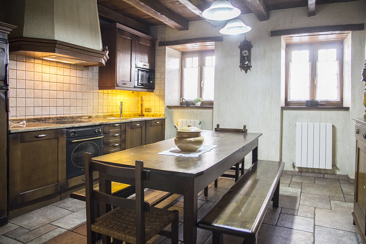Casa Tradicional situada en el núcleo urbano. Dispone en la planta baja de amplio Salón con chimenea y Tv con DVD Home cinema y películas, cocina comedor, y un aseo. En la Primera planta 4 habitaciones dobles con baño incluido, decoración rústica. Patio de losetas de piedra común con otros huéspedes, con pequeña zona de césped, porche cubierto amueblado ,barbacoa . Palas, pelotas y balones para jugar en el frontón del pueblo a 20 metros de la casa. Admitimos mascotas con suplemento.