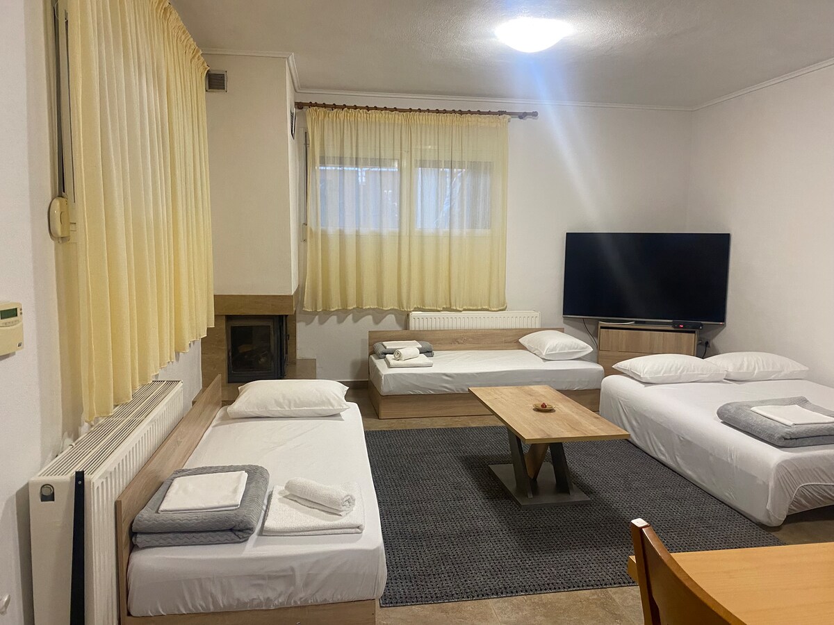 Situado entre 2 pueblos, en los suburbios de Tesalónica, nuestra habitación en el ático ofrece una estancia tranquila en el campo, ideal para las personas que aman la naturaleza (y los animales:). Transporte público al aeropuerto, playas, centro de Tesalónica. Hay muchas playas cercanas a las que puedes ir a nadar (10-15 minutos en autobús). ¡Hay un súper mercado a 10 minutos a pie de la casa! La habitación tiene una cama doble y un sofá cama.
