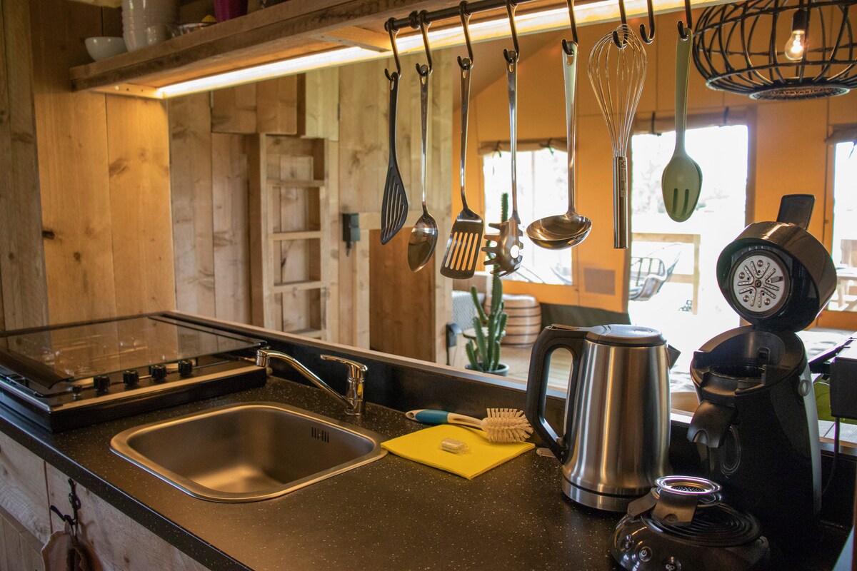 Cabaña de glamping bellamente decorada, equipada con estufa de pellets, baño con ducha, cocina y sala de estar