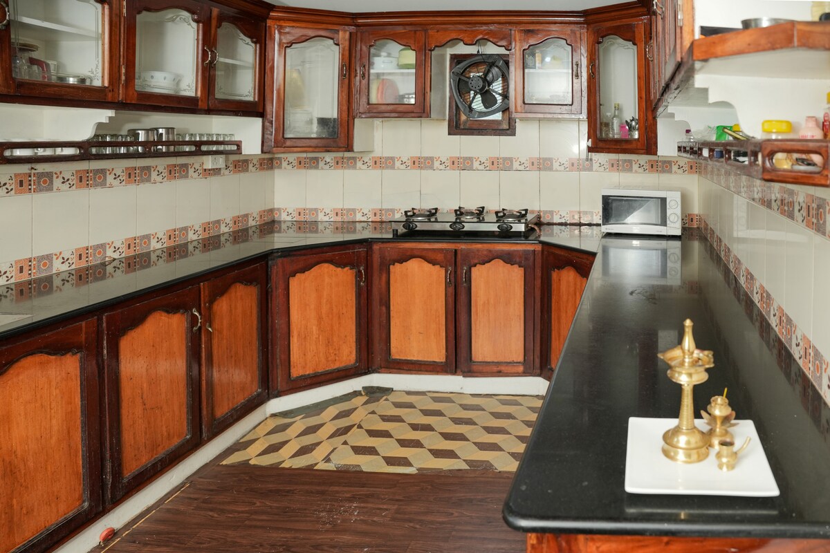 La casa tiene 3 dormitorios, 2AC y uno sin aire acondicionado, todos con baños adjuntos (dos con calentadores),un pasillo y un baño común que rodea un patio central conocido como naalukettu, un sello distintivo de la arquitectura tradicional de Kerala. Todas las habitaciones están bien ventiladas con ventanas con mosquiteros. El salón tiene una mesa de comedor con 6 sillas, sofá y un diwan. La cocina modular con área de trabajo tiene nevera, estufa de gas, purificador de agua Aquaguard, mixie, etc. El pasillo que conduce a la habitación Pooja y un patio son ideales para la relajación.