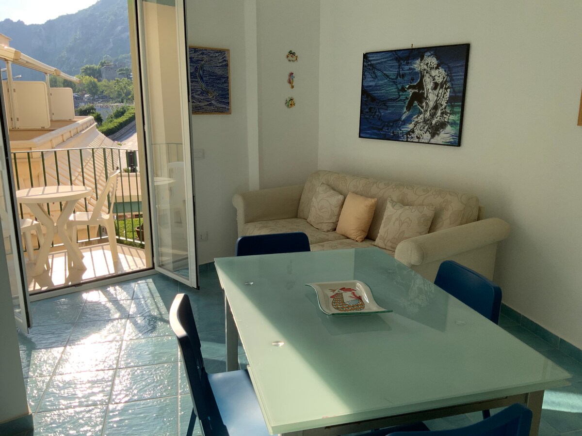 El precioso apartamento fue completamente renovado en 2021. El apartamento está situado en la segunda planta de un edificio antiguo sin ascensor. El apartamento está amueblado con buen gusto en estilo mediterráneo e incluye una cama doble, sala de estar, mesa de mármol de cocina completa y 4 sillas, armario grande, 1 televisor y está equipado con todas las comodidades y servicios, calefacción y aire acondicionado, internet wifi. El apartamento tiene vistas al mar con impresionantes vistas a la península de Sorrento.