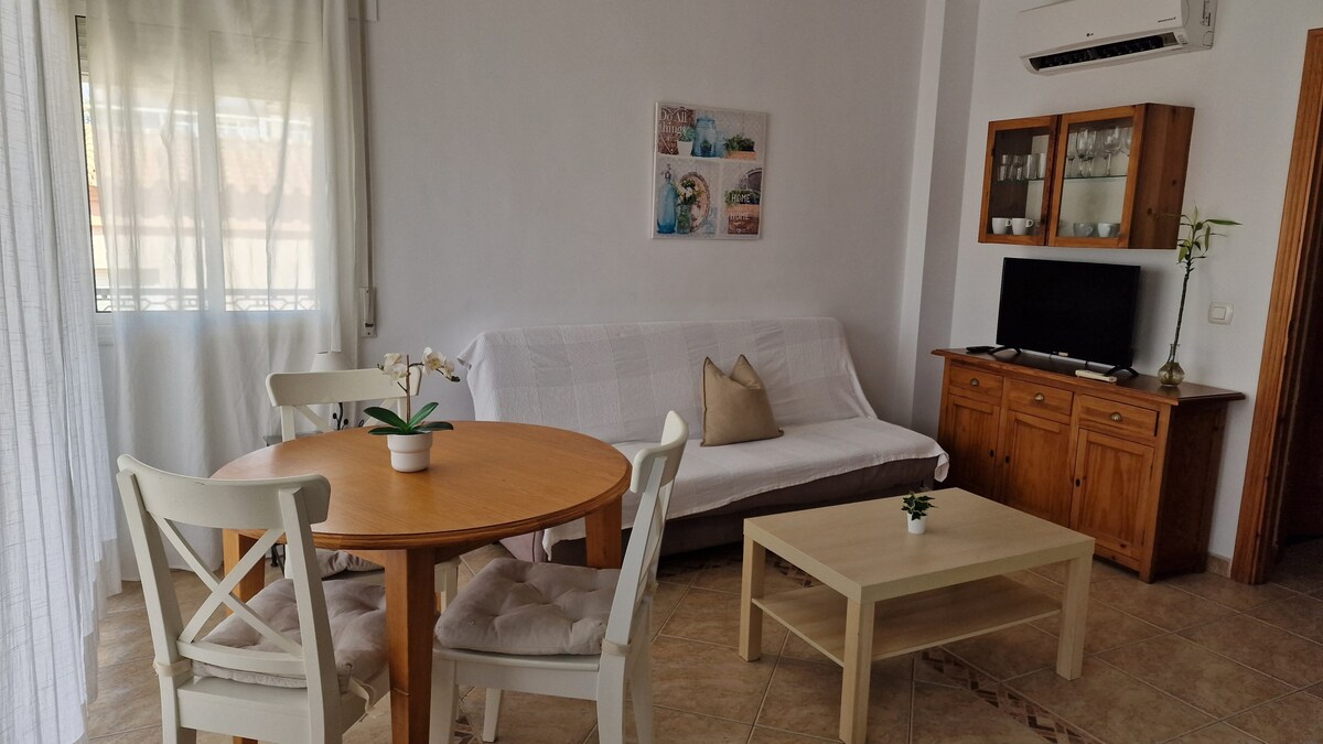 Situado en Nerja, este apartamento de 65 m² en un hotel ofrece alojamiento cómodo para hasta 5 personas, con un salón y 2 dormitorios, además de un baño. Disfrute de una cocina totalmente equipada para su comodidad. El alojamiento dispone de aire acondicionado en el salón, Wi-Fi, televisión, lavadora y espacio de trabajo. También cuenta con acceso sin escalones. Las familias valorarán la cuna, la trona y la cercanía a la playa.