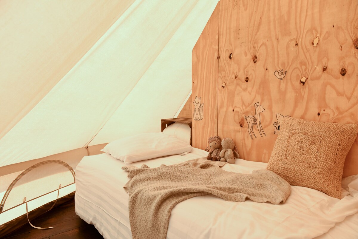 ¡Alójate en nuestra espaciosa y moderna tienda de campaña Tipi, una experiencia única llena de encanto y comodidad! Con un dm de 5,5 metros, la tienda cuenta con una lujosa cama de somier lista (doble o dos individuales) y espacio para una cama supletoria. Totalmente equipado con cocina, mesa de comedor, zona de estar, nevera y terraza privada. El diseño tradicional y los cómodos colchones garantizan una noche de sueño reparador. Ubicado en un tranquilo mini camping con instalaciones limpias. Perfecto para viajeros con equipaje mínimo.