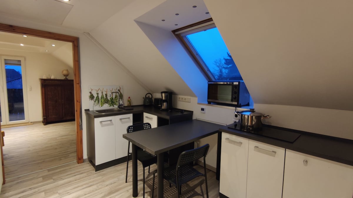 Nos encantan los contrastes: en el ático del castillo de Lanke alquilamos un amplio loft de 100 metros cuadrados. Un loft palaciego. Neorrenacentismo francés por fuera, minimalismo discreto por dentro. La comodidad de la vida urbana se une a la exuberante naturaleza del Parque Natural Barnim. Ambos crean el escenario perfecto para el descanso, la relajación y la desconexión. En el Schloss Lanke, además de los apartamentos de vacaciones, se encuentran las viviendas de los propietarios, así como espacios de oficina en la planta baja. Respetamos nuestra privacidad.