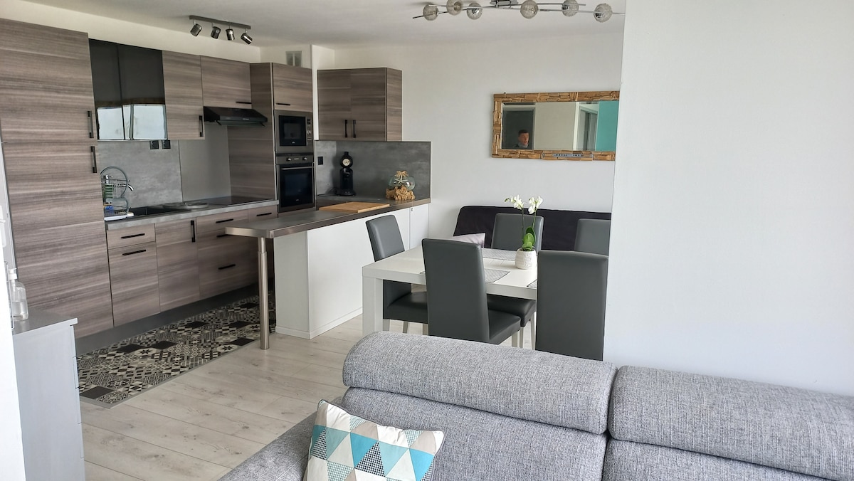 Relájese en este apartamento de una sola planta tranquilo y elegante a dos pasos del mar. Para darle la mejor bienvenida, este apartamento consta de: Una cocina equipada con horno, Microondas, lavavajillas, refrigerador con congelador pequeño, placas de inducción, tostadora, hervidor de agua, croqueta Mr, cafetera tradicional. 📺 TV Habitación: cama de 140 x 190 (sábanas incluidas) Sofá convertible en el salón: 140x190 (sábanas incluidas) Niños: Cama BB plegable + colchón +silla BB