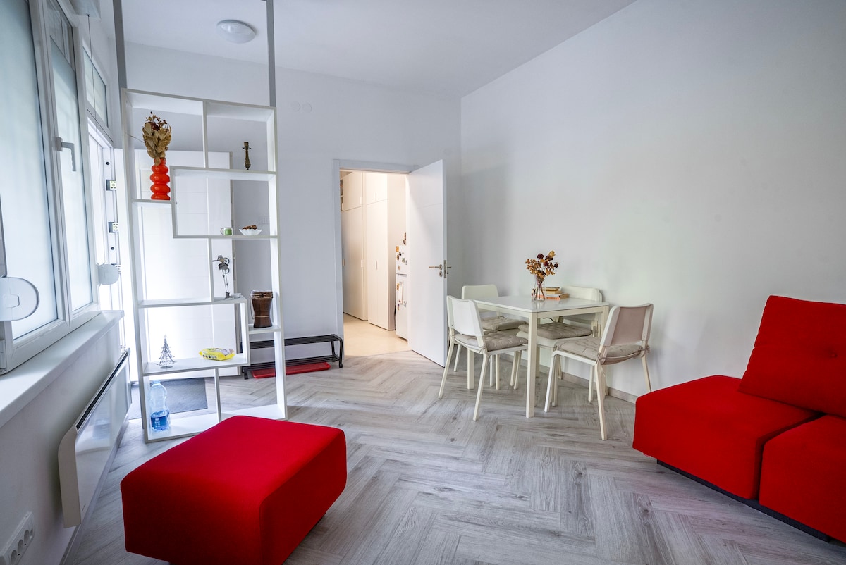 Bright and cozy apartment for four people in the heart of New Belgrade. With free public parking in front of the building and excellent connections with public transport that stops in front of the building, including a direct bus to the airport, this apartment is ideal for you. The apartment is located on the 3rd floor and has a separate bedroom and an additional bed in the living room that folds out into a double bed. It has a kitchen and bathroom with everything you need.