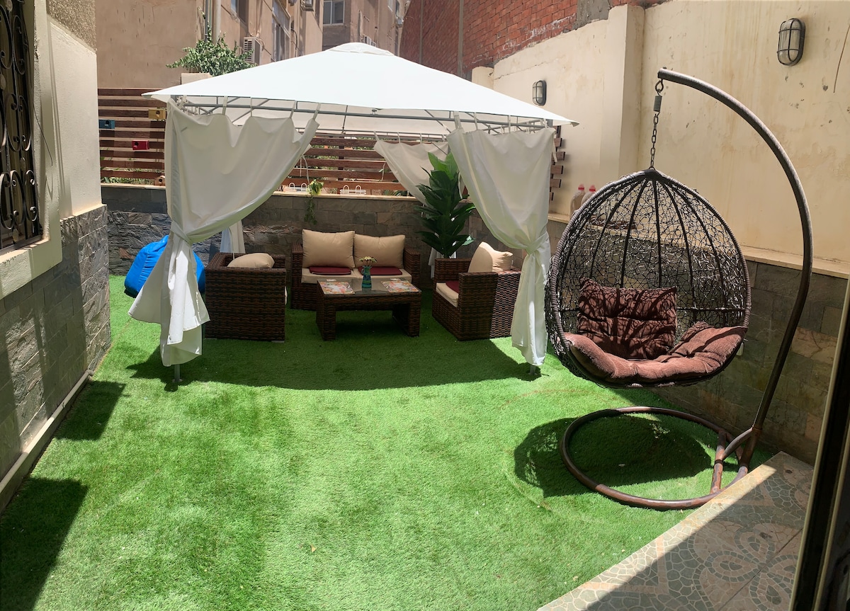 A cozy and modern private rooftop apartment in the heart of 5th Settlement, New Cairo, featuring a beautiful open view of gardens, sky, and stars at night. Enjoy total privacy, a spacious outdoor terrace with seating, swing chair, and grill, plus a stylish interior designed for comfort. Quiet, relaxing, and within walking distance to shops and daily needs—perfect for a peaceful stay with a great view.