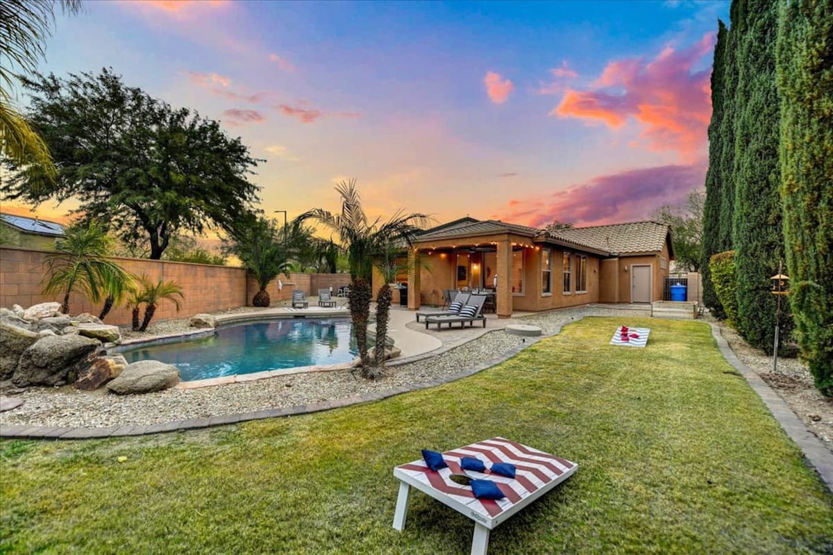 ¡Explora Phoenix con estilo! Alójate en nuestra casa de una sola planta en una comunidad cerrada y serena, a pocos minutos de autopistas y tiendas. ¡Las mascotas se alojan gratis! Las características incluyen televisores inteligentes en todas las habitaciones, una piscina climatizada PRIVADA de cortesía (sin cargo), acabados de lujo, cocina totalmente equipada, garaje para 2 coches y muebles completos para tu máxima comodidad. ¡Perfecto para una escapada relajante! ¡A solo 20 minutos en coche del lago Pleasant! Se admiten mascotas y apoyamos la igualdad. A minutos de las tiendas y de todas las autopistas principales.