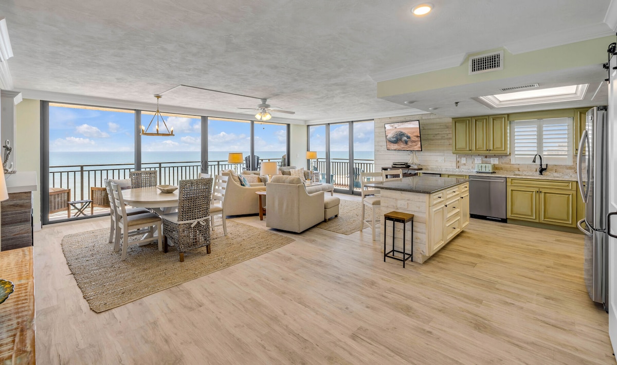 Disfruta de impresionantes vistas al mar desde todos los rincones de esta unidad bellamente remodelada, que ofrece 1.385 pies cuadrados de verdadero paraíso. La amplia sala de estar, amueblada con muebles nuevos, ofrece un entorno ideal para disfrutar de las impresionantes vistas del océano y la piscina. Disfruta de la relajación durante todo el año con una piscina climatizada. Además, aprovecha el estacionamiento gratuito en el garaje para tu comodidad. Nuestro huésped siempre dice que este es el Airbnb mejor surtido en el que se han alojado.