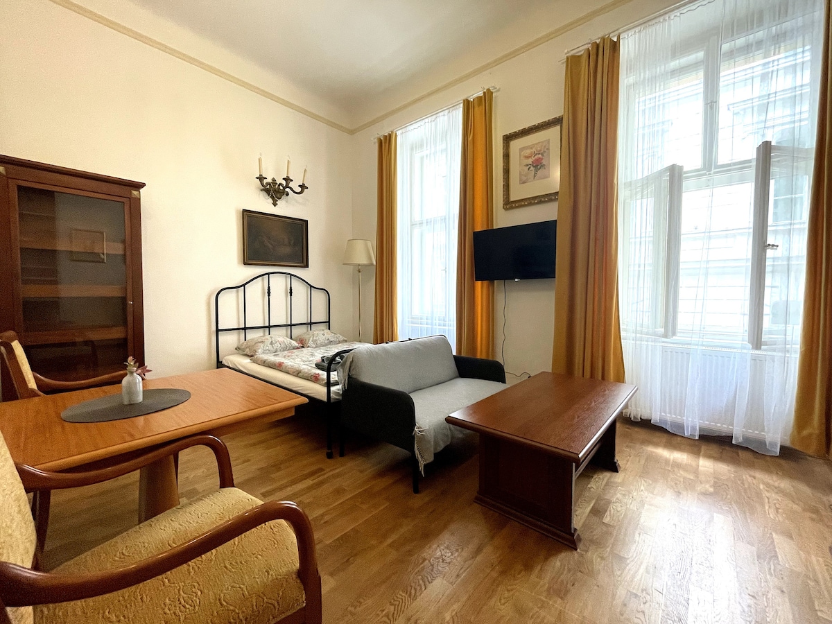 Bienvenido a nuestro luminoso apartamento de dos habitaciones con pequeño balcón en el centro de la ciudad de Praga 1 (Krakovská 1327/13), pero en una calle tranquila, a solo 2 minutos a pie de la plaza Wenceslao, a pocos pasos del precioso Museo Nacional. TV, wifi. El apartamento de dos habitaciones es perfecto para una pareja o 2 amigos. Situado en el cuarto piso (así que no te preocupes si tienes una maleta pesada), hay un ascensor. Hay aparcamiento disponible por 10 EUR/noche.