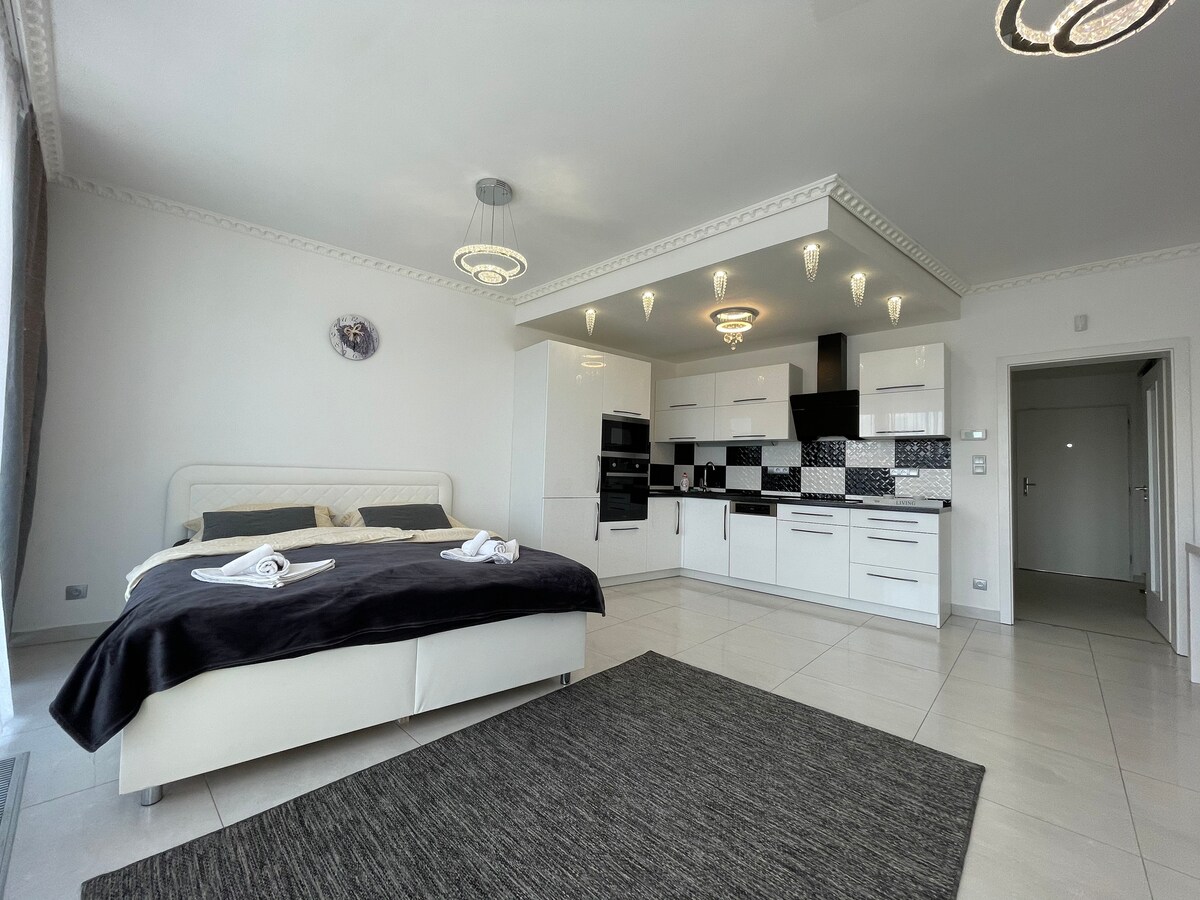 Pequeño apartamento moderno y acogedor con balcón y proyector con Netflix. El apartamento está situado en una zona tranquila rodeada de hermosa naturaleza. El apartamento no está en el centro, el trayecto al centro dura unos 30 minutos, pero el transporte es muy accesible (autobús, tren, tranvía). Gracias a ello, los alrededores del apartamento son completamente tranquilos e ideales para pasear por la naturaleza, hay varios lugares naturales hermosos al alcance del apartamento. El apartamento tiene una plaza de aparcamiento privado gratuito.