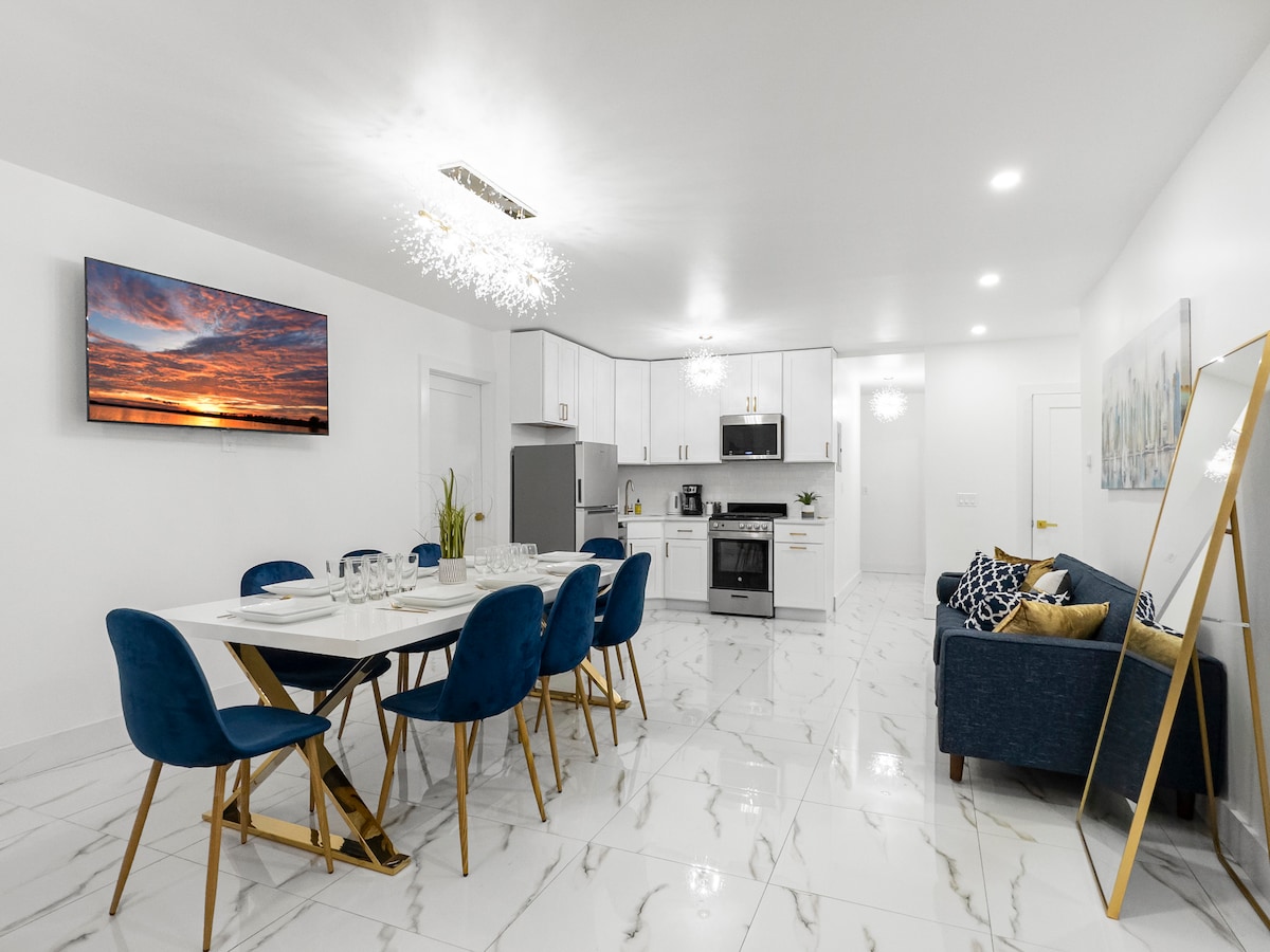 Dúplex de 4 dormitorios y 2,5 baños de nueva construcción con terraza privada y vistas a Manhattan. Televisores inteligentes en la sala de estar y en todos los dormitorios con WIFI gratuito. TV por cable que se proporciona en la sala de estar. Cocina equipada con electrodomésticos de acero inoxidable. Se proporcionan utensilios de cocina, estante para especias y cápsulas de café Keurig. Se proporciona ropa de cama, toallas y artículos de limpieza. Lavandería gratuita (lavadora/secadora) en la unidad.