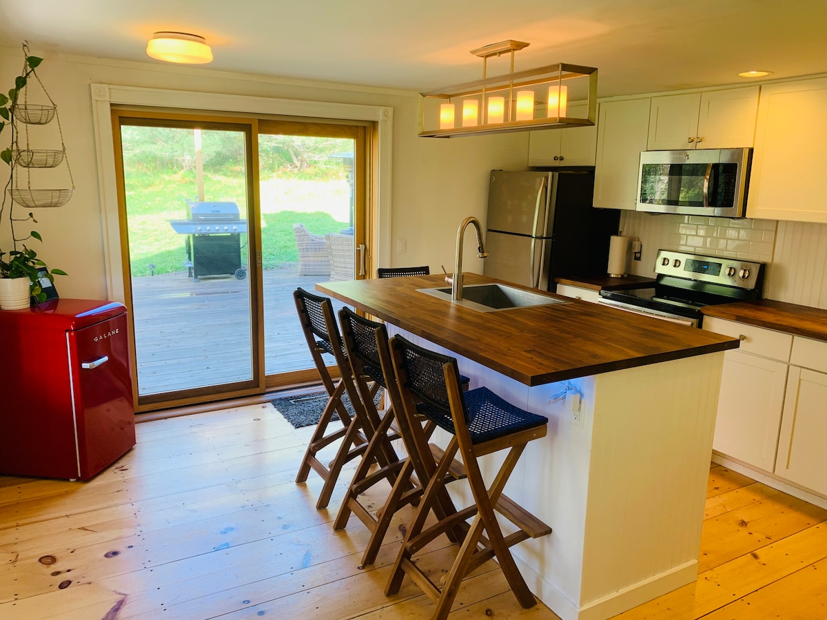 Escápate a nuestra casa de huéspedes recientemente renovada en una propiedad de 12 acres, a 15 minutos de Hudson. Disfruta del entorno rural a través de puertas de cristal de gran tamaño. La sauna de infrarrojos está a poca distancia del estanque para nadar y darse un chapuzón frío. Ubicado en un parque como un entorno de colinas onduladas y coloridos arces azucareros. Cocina totalmente equipada, colchón de espuma viscoelástica y todas las comodidades. Masaje/yoga disponible en el hogar. ¡Esquí de fondo desde la casa! A 45 minutos de las pistas.