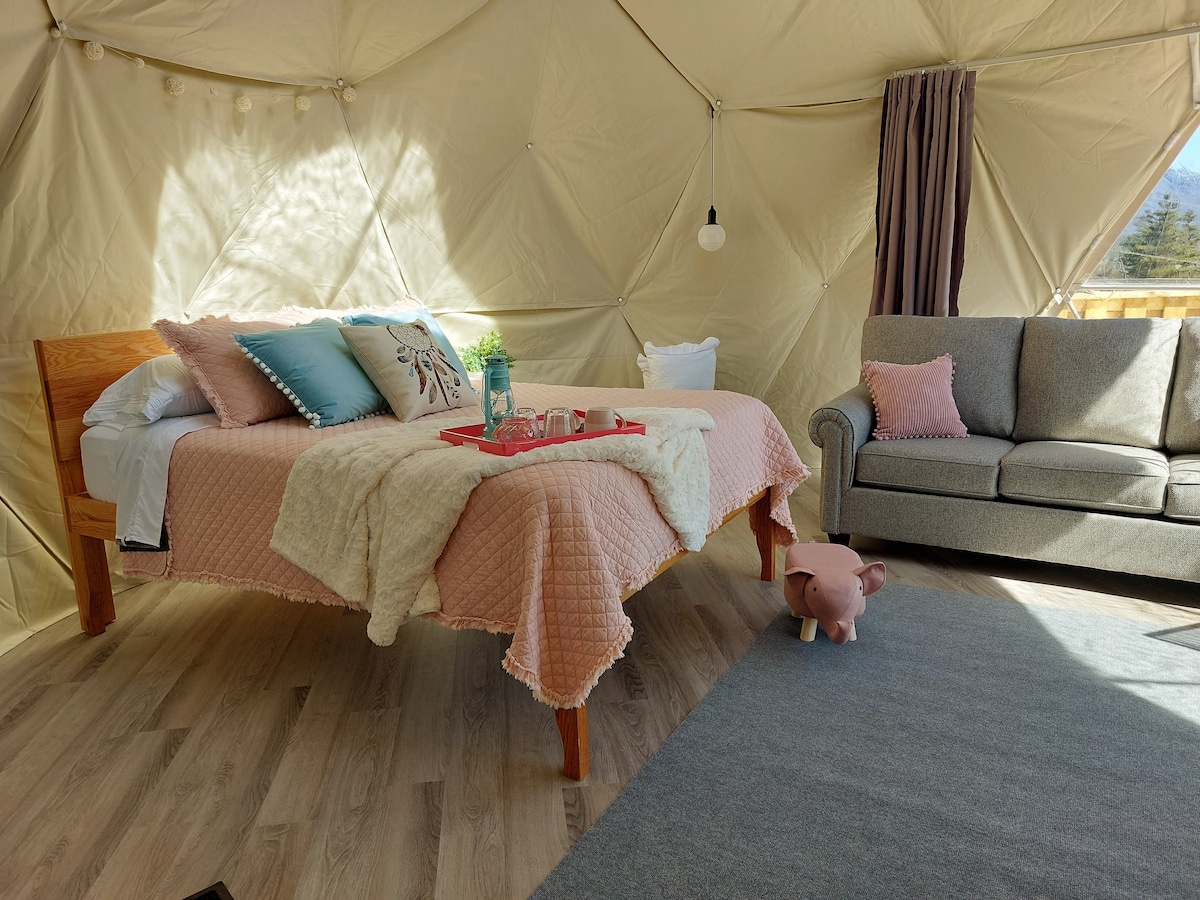 This modern style of camping takes you inside a geodesic dome overlooking beautiful Trout River, Tablelands and a mountain formation known to locals as the Elephants Head. One queen bed with a comfy pillow top mattress is the perfect way to end your day. A pullout sofa bed, linens, towels, outdoor firepit, picnic table, BBQ, cookware, dishes, cooler & utensils. All you need is clothes, personal toiletries and food! Don't forget your cozy slippers! Gros Morne Glamping has other listings!