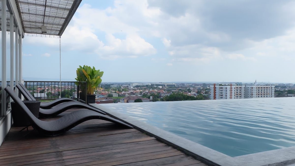 Apartamento de lujo en el corazón de la ciudad. Con magníficas vistas del monte merapi, unidad colocada en piso alto. Instalaciones de primera categoría como gimnasio, piscina infinita con vista al cielo y vestíbulo acogedor. Tu familia estará cerca de todo cuando te hospedes en este lugar céntrico.