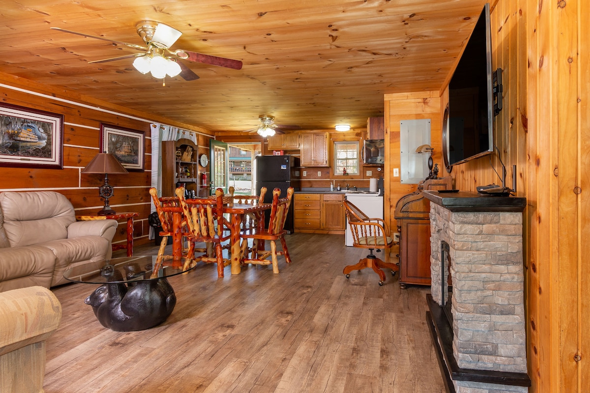La cabaña número dos es una cabaña acogedora. Disfruta de un columpio y mecedoras en el porche delantero. Relájate y desconecta sin dejar de estar cerca de las atracciones locales. La cabaña ofrece tres dormitorios. El dormitorio principal tiene una cama tamaño queen y una sala de estar, el dormitorio 2 tiene una cama completa y una cama individual, el dormitorio 3 tiene una cama individual. La sala de estar ofrece un sofá cama y un sofá adicional. La sala de estar ofrece una chimenea eléctrica. La sala de estar tiene una pequeña zona de escritorio. El porche trasero también tiene una lavadora/secadora en la habitación trasera.
