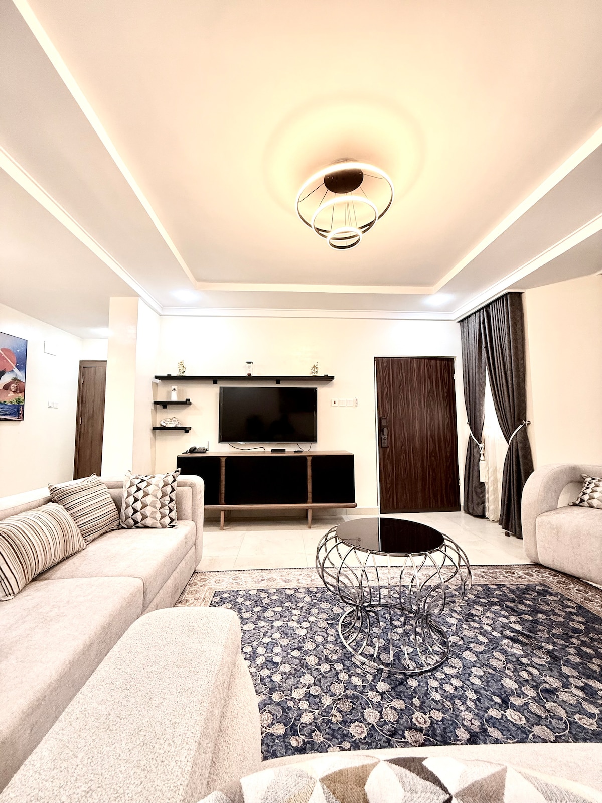 Imagine waking up in a cozy, stylish apartment right on the Lekki-Epe Expressway — where comfort, convenience, and modern living meet. Whether you’re in Lagos for business, leisure, or a little bit of both, this 3-bedroom apartment in Lekki is designed to give you the perfect stay. Step into a spacious living room adorned with modern furniture, elegant paintings, and soft curtains that set the tone for your relaxation. Perfect for a quick getaway, a business trip, or a family holiday!