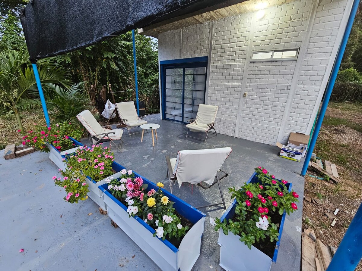 La casa cuenta con dos habitaciones y rentamos una de ellas con acceso a una pequeña piscina privada, patio, bbq y nevera La casa se comparte con mi mamá quien vive en la otra habitación, algunos espacios como la cocina, el garage y otras zonas comunes se comparten Es una finca a las afueras del casco urbano, así que es muy común ver algunos animalitos como lagartijas y otros. Es recomendado usar repelente para mosquitos en las horas de la tarde y tener en cuenta que hay 3 perritos en la finca