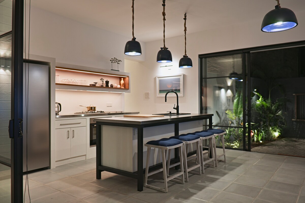 La casa Hiru en Hiriketiya es una nueva residencia moderna de 4 dormitorios de estilo plantación, perfecta para familias numerosas o grupos. A un corto paseo de la playa, pero escondido en un exuberante jardín privado, es ideal para relajarse o entretenerse. Puede que veas monos juguetones cerca: ¡son inofensivos y forman parte del encanto tropical! Disfrútalos desde la distancia y evita darles de comer.