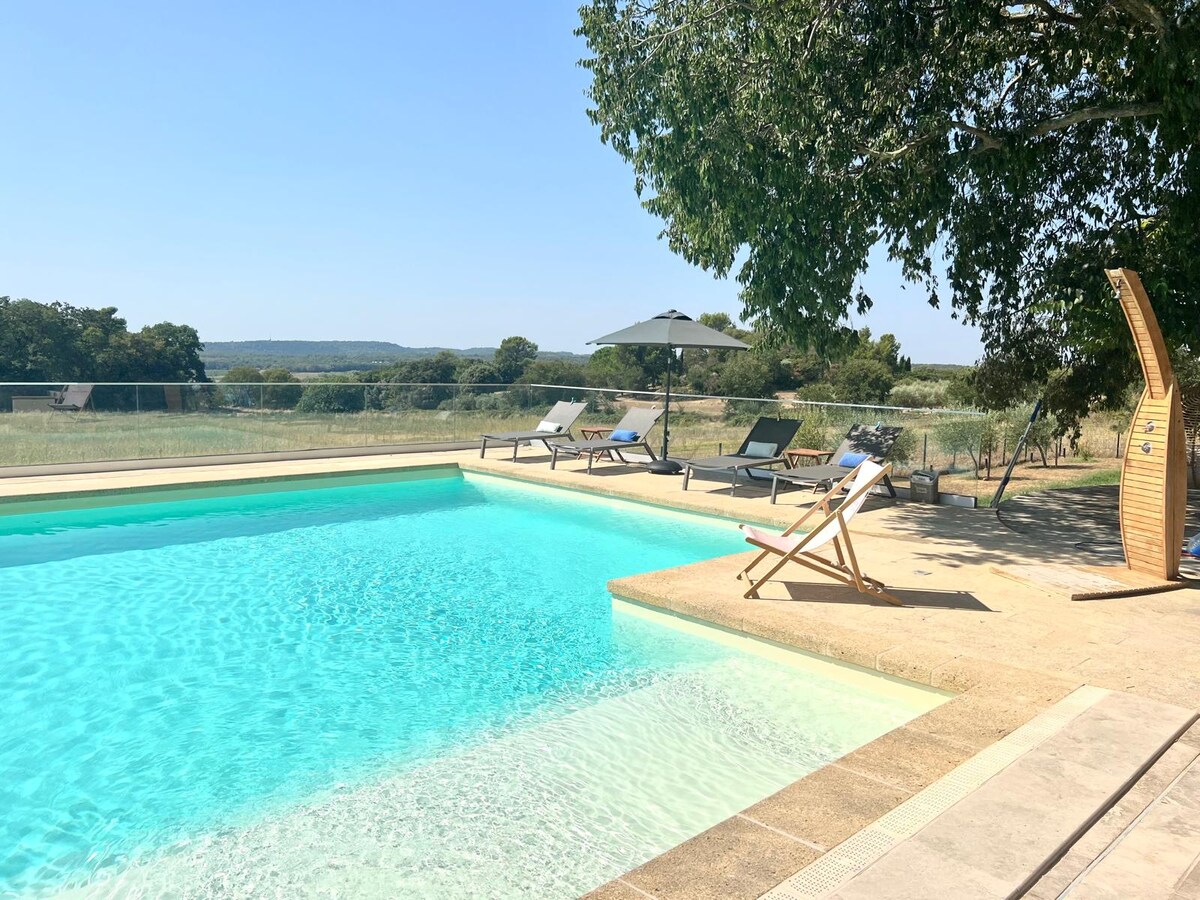 Relájese en este alojamiento tranquilo y elegante. Situado en Sussargues en el Hérault, en el corazón de los viñedos y la Garrigues, a 25 minutos de Montpellier y la playa, en un pequeño pueblo con todas las comodidades, este estudio le hará viajar gracias a su decoración. El estudio es adyacente a nuestra casa donde vivimos con nuestros 2 hijos. Agradable piscina, tratada con sal, al abrigo de las miradas. Jardín y gran terraza.
