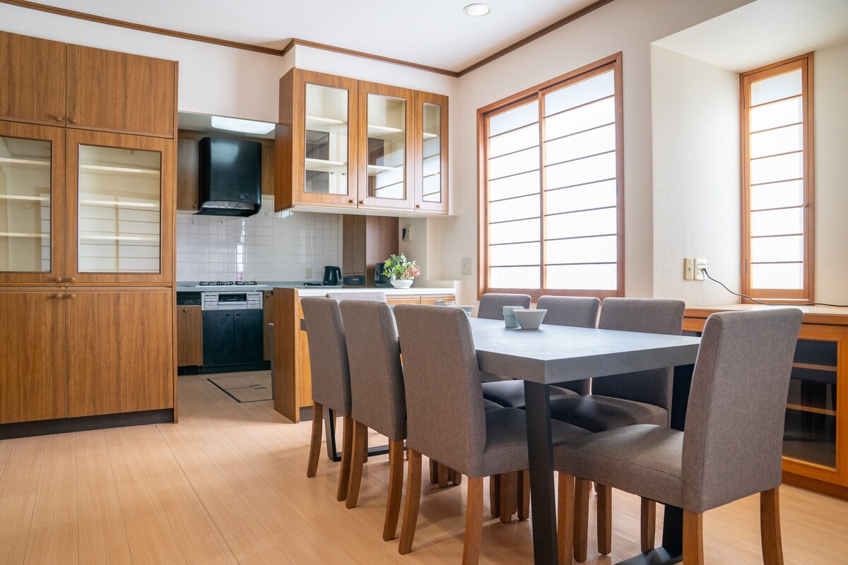 広島駅から電車と徒歩で19分!200年の歴史がある広大な日本庭園と本格和室のある閑静な一戸建てをまるごと貸し出します。希望者には日本の着物の着付け無料サービスがあり、着物を着て伝統的な日本茶の儀式も体験できます。庭に桜があり、3月終わりから4月初めはきれいです。ツツジは5月頭に満開です。広いリビングから庭園が見渡せます。 広島駅までJR山陽線13分の安芸中野駅の近くです。安芸中野駅から宿まで徒歩6分です。新幹線や空港からの連絡バスにスムースに乗れます。当到後に荷物を置くことも可能です。 駅に近いですので、平和公園へ行きやすく、宮島へは直通JRで45分です。この宿を起点に呉、大久野島、尾道、倉敷、鞆の浦を訪れることができます。2台停めれる無料駐車場もあります。 ホストは横の家におり備品の追加や買い物をサポートします。徒歩1分でコンビニエンスストアのローソンがあります。 家族全員がのびのび楽しめる広大な宿泊先です。お子様用のおもちゃがたくさんあり、飽きずに泊まれます。ご家族、ご友人でゆっくりお過ごしください。 ※自然が近いため、春から秋は宿の外に虫が出ます。苦手な方は遠慮ください。