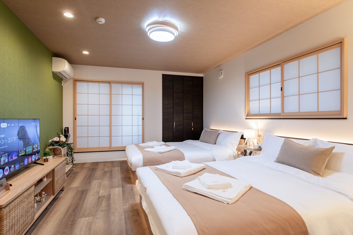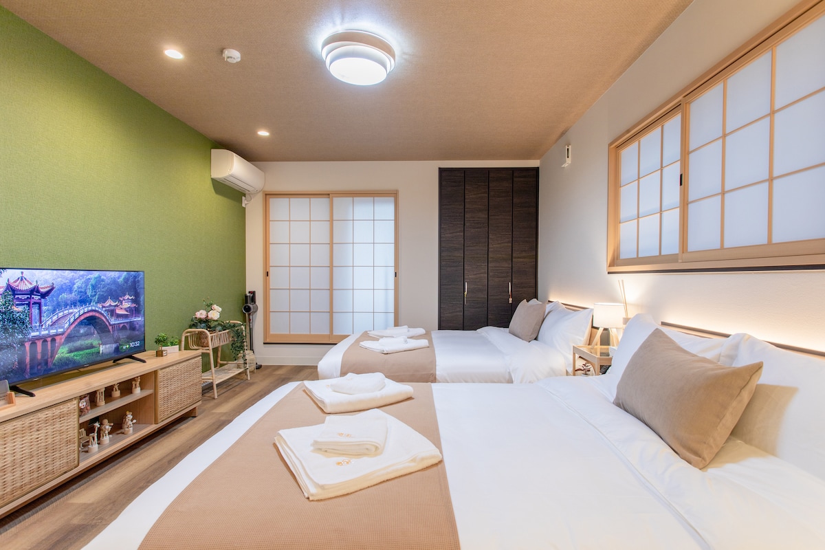 Acerca del alojamiento “JAPAVISTA ASAHI” es una villa privada sostenible (147,8 ㎡, 3 habitaciones, sala y cocina) creada mediante la reutilización de madera recuperada y la preservación de la arquitectura tradicional japonesa. Esta estructura histórica se ha renovado para ofrecer comodidades modernas. A 8 minutos a pie de las estaciones de Tengachaya y Hanazonocho, la villa ofrece un acceso cómodo: a solo 2 estaciones (5 minutos) de Namba y a unos 35 minutos del Aeropuerto Internacional de Kansai. Esta espaciosa propiedad puede alojar hasta 10 huéspedes.