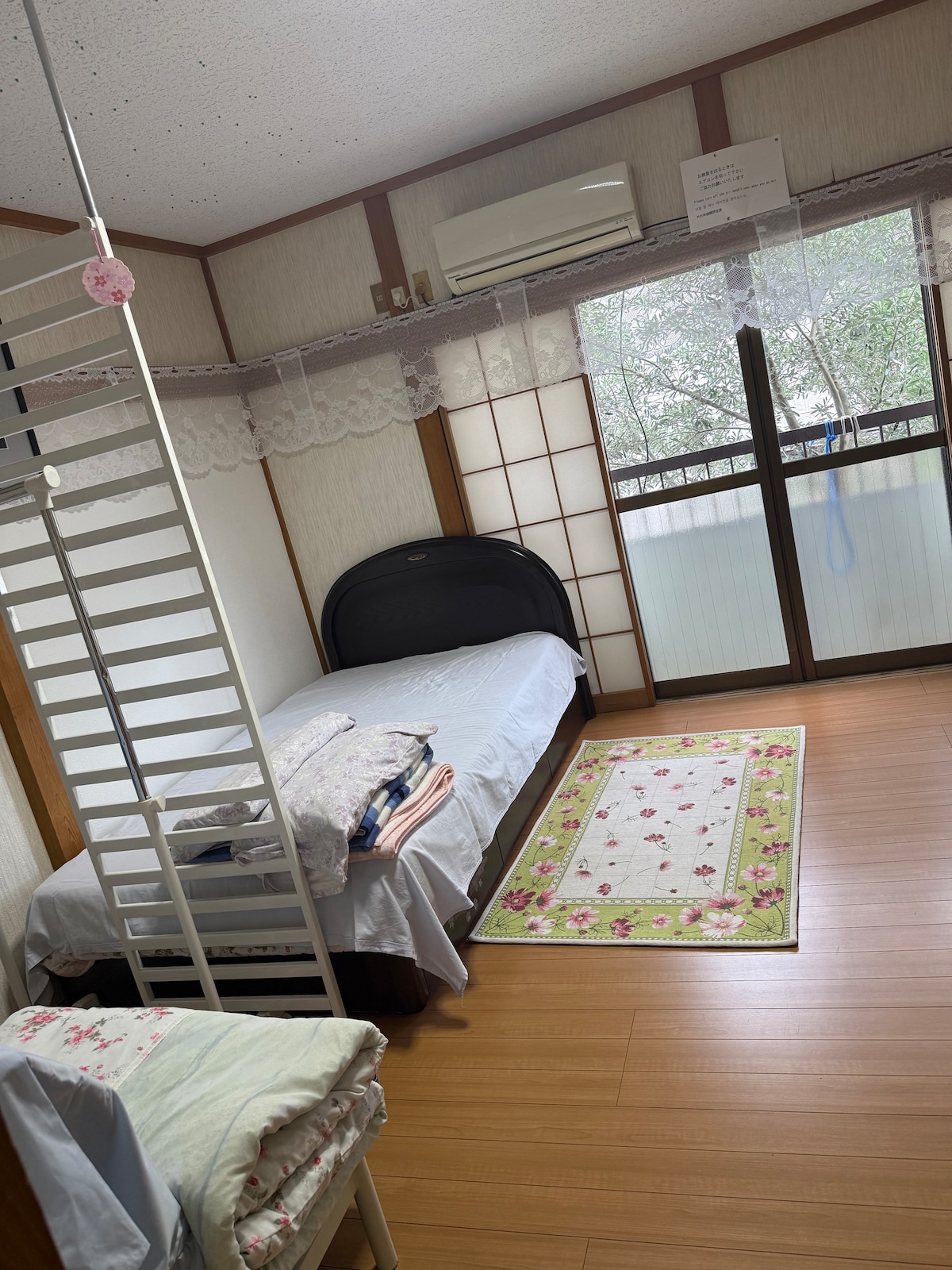 This is a standalone house located just a 30-second walk from the Akikawa Bridge River Park BBQ Land. The guest room is a 11.5-tatami-mat bedroom on the 2nd floor. It features one semi-double bed, and the room can accommodate an additional four single futons, allowing a total of five guests to stay. The kitchen and dining area retain the nostalgic atmosphere of the Showa era. The kitchen is equipped with a refrigerator, microwave, toaster, and rice cooker. Dinnerware is available for your use.