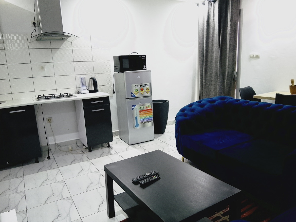 Studio dans un immeuble nouvellement construit. Emplacement : Logpom, Carrefour Commandant, après les maisons jumelles. 💡 À savoir : afin de garantir les meilleurs tarifs pour un appartement de ce standing, l’électricité est laissée à la charge du résident, via un compteur prépayé. Cela permet d’éviter des frais fixes plus élevés dans le prix de la nuitée. En cas de coupure, le groupe électrogène fonctionne sans frais de 18h à 7h, et 24h/24 le week-end pour assurer votre confort.