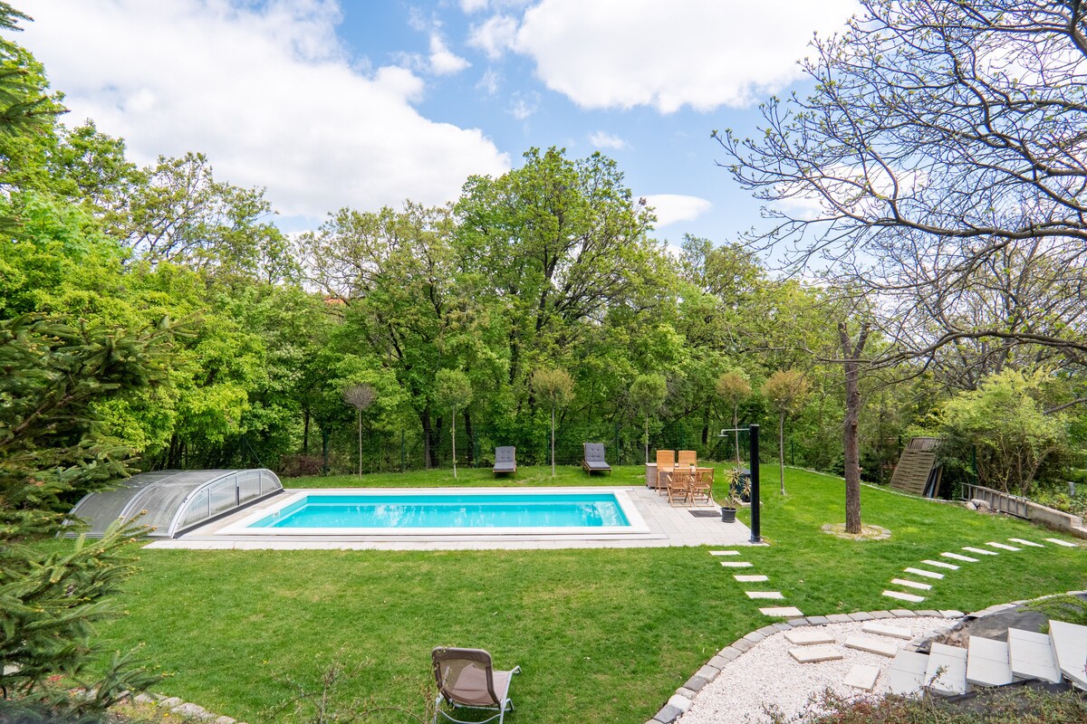 Oasis de bienestar junto al bosque en Szentendre: ¡jacuzzi privado y panorama del Danubio! ¡Relájate en la naturaleza en este departamento totalmente equipado cerca del bosque! Disfruta de un jacuzzi privado, sauna de infrarrojos, piscina climatizada según la temporada y barbacoa en el espacioso jardín. Las vistas del Danubio y el aire fresco garantizan una recarga. También hay disponible un espacio de carga para autos eléctricos. ¡Reserva ahora para el retiro perfecto!