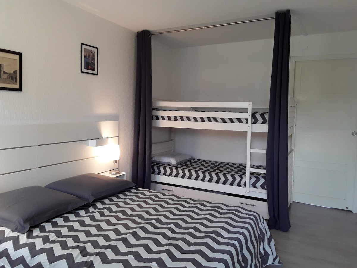 Apartamento dúplex en el primer y último piso con una gran terraza de 12 m2 , una sala de estar con cocina totalmente equipada, placa horno microondas gran nevera congelador tostadora TV wifi sofá lavadora y WC . Arriba hay una gran habitación dividida en 2 por un lado 1 cama de matrimonio y por el otro 2 literas y baño. Este apartamento está en el centro de Barbâtre, las tiendas están a 3 ms a pie restaurantes , panadería y + playa 5ms paso del Gois 5 m y aparcamiento privado.