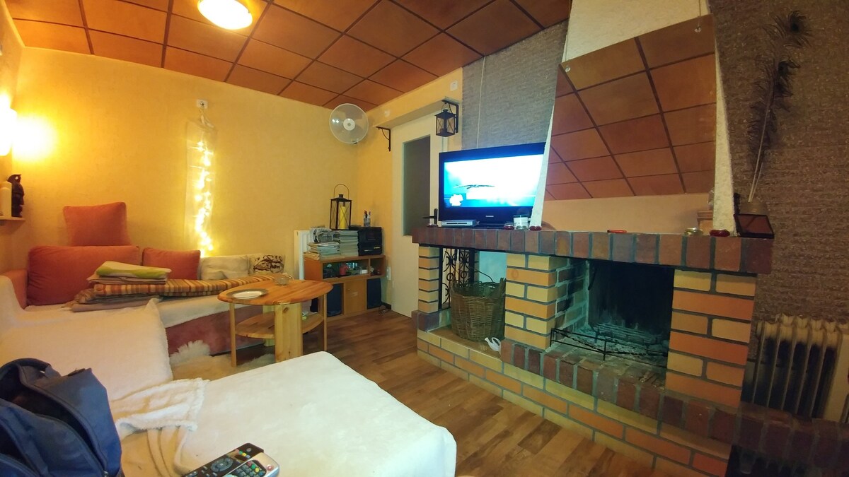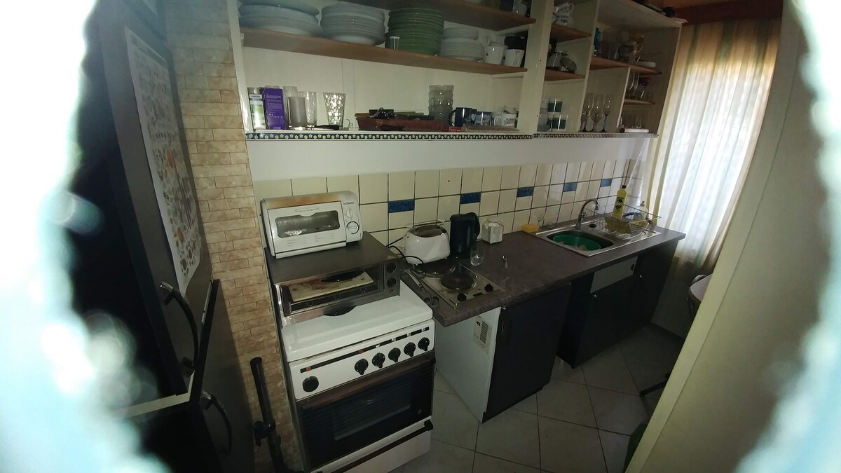 Senderismo junto al embalse del pueblo, medio piso, baño con agua caliente, un dormitorio con cocina pequeña con refrigerador, estufa, lavabo, lavavajillas, mesa de comedor, 8 asientos, juego de estar.