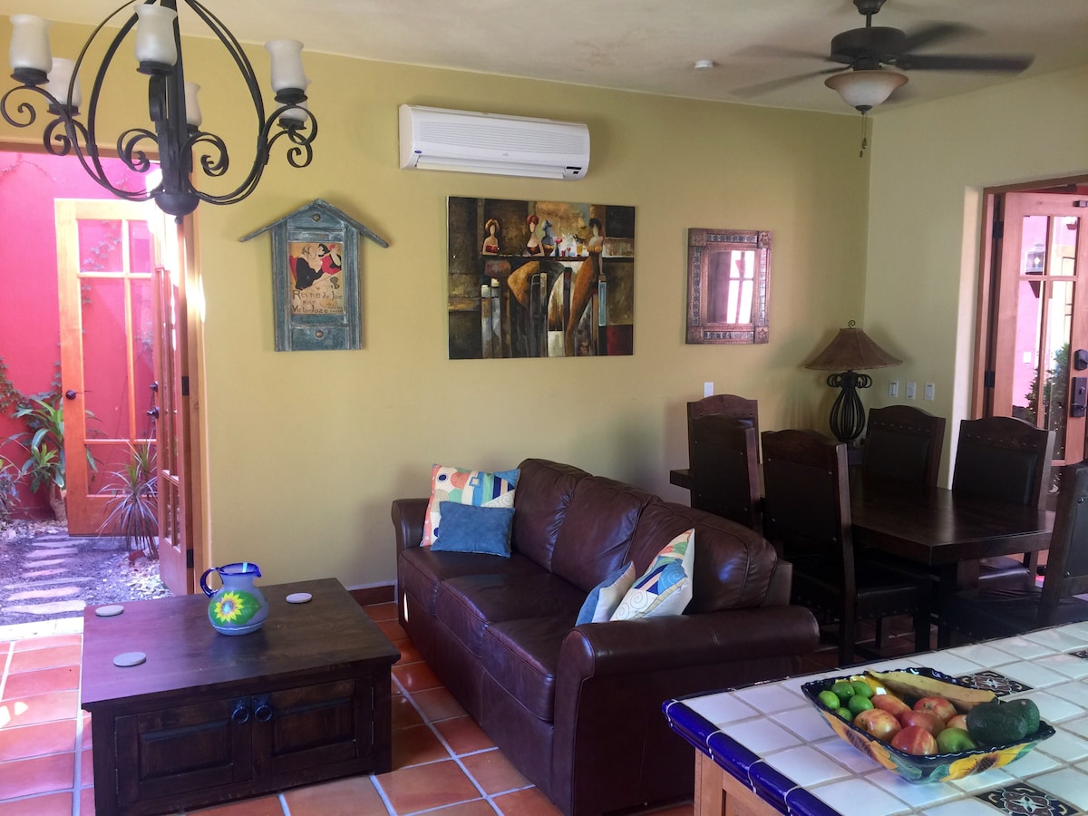 Casa mexicana contemporánea ideal para descansar, trabajar y disfrutar del maravilloso Mar de Cortes y los mejores atardeceres al pie de la Sierra de la Giganta. A 10 mins del mar caminando entre hermosos andadores con aromas colores, canto de aves y campo de golf. Cómodo espacio abierto donde cocina sala y comedor conviven entre 2 patios y fuentes. Recamara privada con armario, internet, area de trabajo y baño. EN PLANTA BAJA Ideal para parejas y familia pequeña que quieran gozar del paraíso!
