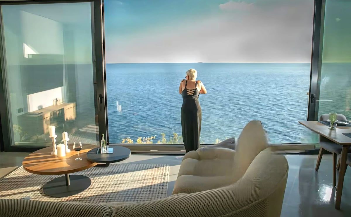 The island's only private funicular - glide directly from your residence to the beach. NYX is a generously zise one-bedroom Aegean sanctuary within The Cliff Residences, a boutique complex of four individually designed villas: Gaia, Aphrodite, Selene, and Nyx. Floor-to-ceiling views. Complete privacy and the sea at your doorstep.