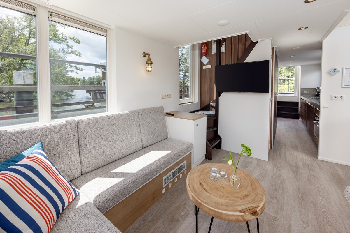 ¡Sube a bordo del nuevo Rivercottage! Esta casa de vacaciones flotante ofrece todo lo que necesitas para explorar la naturaleza holandesa. Disfruta de una ducha caliente, internet, calefacción y una cocina totalmente equipada. El barco está equipado con todas las comodidades de casa. Gracias a los paneles solares, estás completamente “desconectado de la red” con 1000 litros de agua potable disponibles. Al reservar varios días, puedes navegar tú mismo, ¡no se requiere licencia! (lee la información adicional) ¡Envíame un mensaje para hablar sobre tus preferencias!