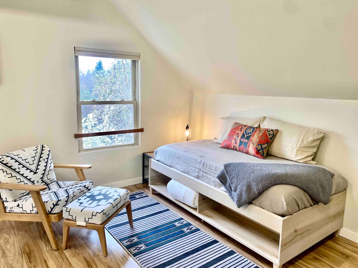 Excelente ubicación con vistas al bosque de secuoyas. Nuestro bungalow está totalmente equipado. Vuelve a casa con tu botín del mercado de agricultores y haz uso de la cocina bien surtida o de la parrilla del balcón. Ponte cómodo en la sala de estar con solo pulsar un botón con la chimenea de gas y la Smart TV. Duerme profundamente en la cama tamaño king o queen. Si tienes personas adicionales, puedo proporcionar un colchón inflable. Camina desde tu puerta hasta Cal Poly Humboldt, Arcata Plaza y Shay Park. Una maravillosa base de operaciones.