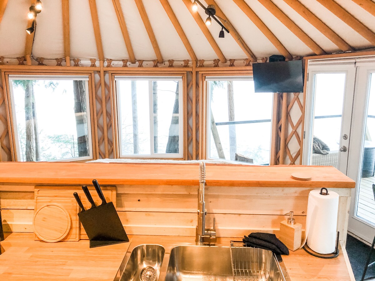This luxurious oceanfront yurt is hidden in an ancient cedar grove providing privacy and an amazing backdrop to its unprecedented ocean front setting. Set atop an ocean front rock face with a fully covered patio. A fully equipped kitchen and spa like bathroom highlight the luxurious amenities included in this stay. An upscale romantic getaway like no other. Breakfast provided, our guests receive coffee, teas, and light breakfast fare.