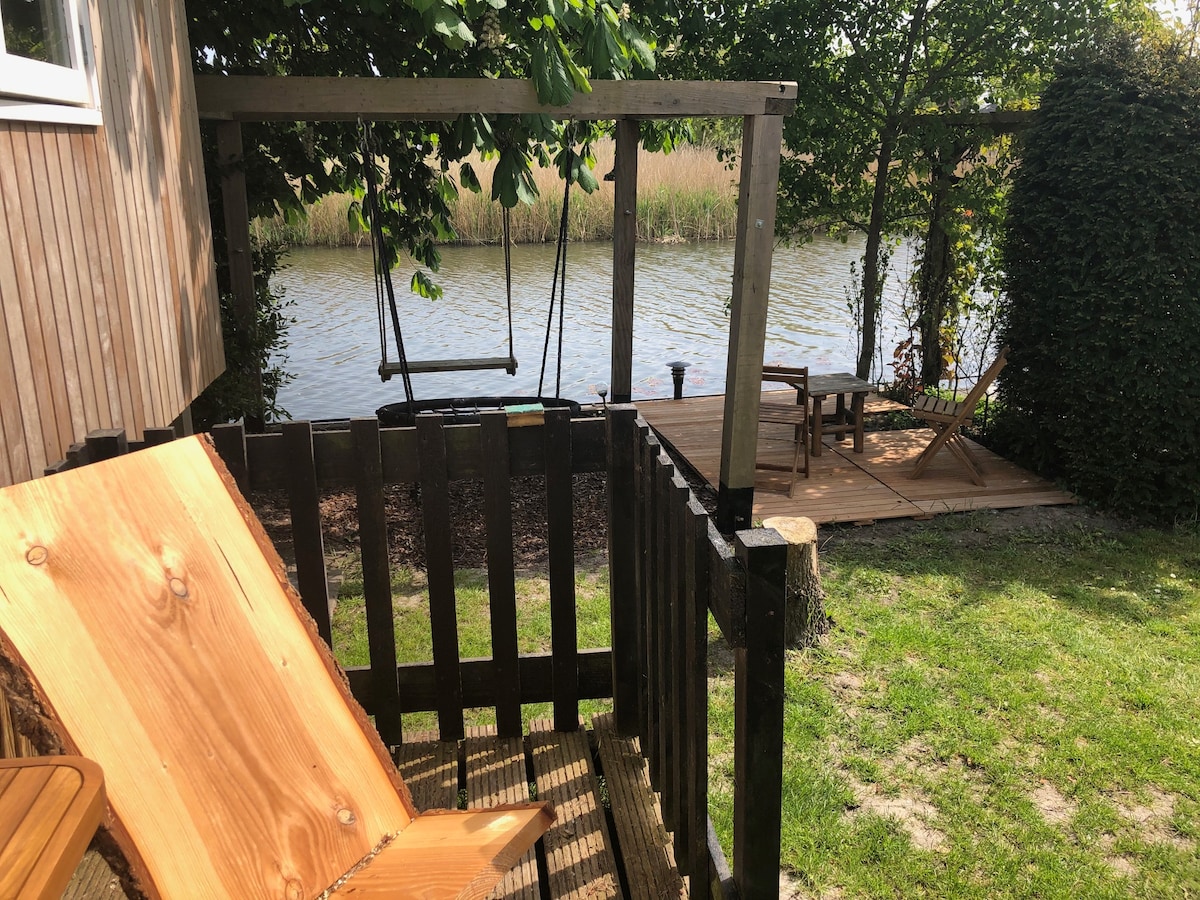 Estancia romántica con vistas desde tu cama sobre el agua y un columpio doble Desde el asiento del amor, puedes ver la televisión o la chimenea (calefacción) y lo tendrás acogedor en invierno o en verano puedes disfrutar leyendo o jugando juegos al aire libre en la terraza en el agua. Se puede reservar jacuzzi, kayak o 2 tablas de paddle. También hay bicicletas que puedes pedir prestadas de forma gratuita. El baño está a 1 paso fuera del Pipo y todo solo para ti.