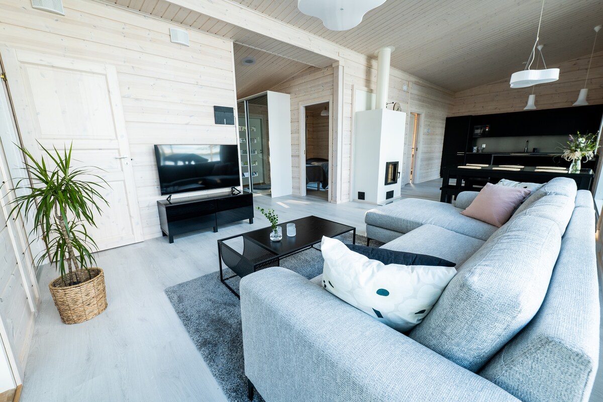 Casa nueva cerca del lago. Lugar tranquilo. A 25 minutos de Oulu. Parada de autobús a 500 m. Cocina, salón, 2 dormitorios, sauna, baño. Posibilidad de esquiar o caminar en el lago o el bosque. Máximo 4 personas. Jacuzzi +50e/día (límite -20c). Mínimo 2 días. Se puede recoger en Oulu o Kiiminki. 4 juegos de esquís de fondo y raquetas de nieve de uso gratuito. Puedo organizar trineos de husky, caza de Aurora y otras actividades de invierno. Ei juhlia, máx. 4 vierasta. Oulu a 25 min Rovaniemi 2,5 h