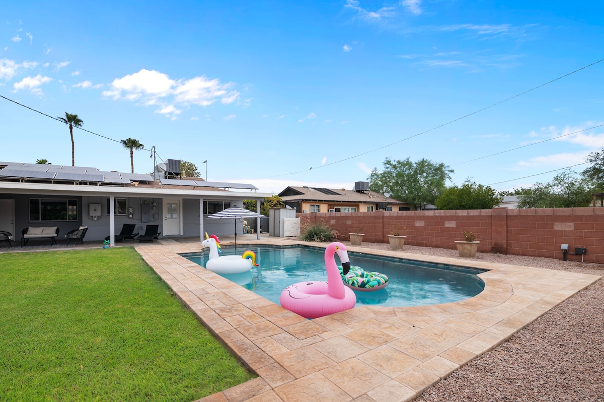Bienvenido a tu mejor alquiler vacacional en Scottsdale. Esta impresionante propiedad ofrece un increíble patio trasero, creando un verdadero oasis para que disfrutes. Sal y descubrirás un refugio bellamente ajardinado con un patio cubierto, que ofrece amplios asientos para disfrutar del espléndido clima de Arizona. La cocina al aire libre es lo más destacado, equipada con una parrilla incorporada, fumador Big Green Egg, fregadero y refrigerador; asegurándose de cocinar y entretenerse sin esfuerzo para ti y tus huéspedes.