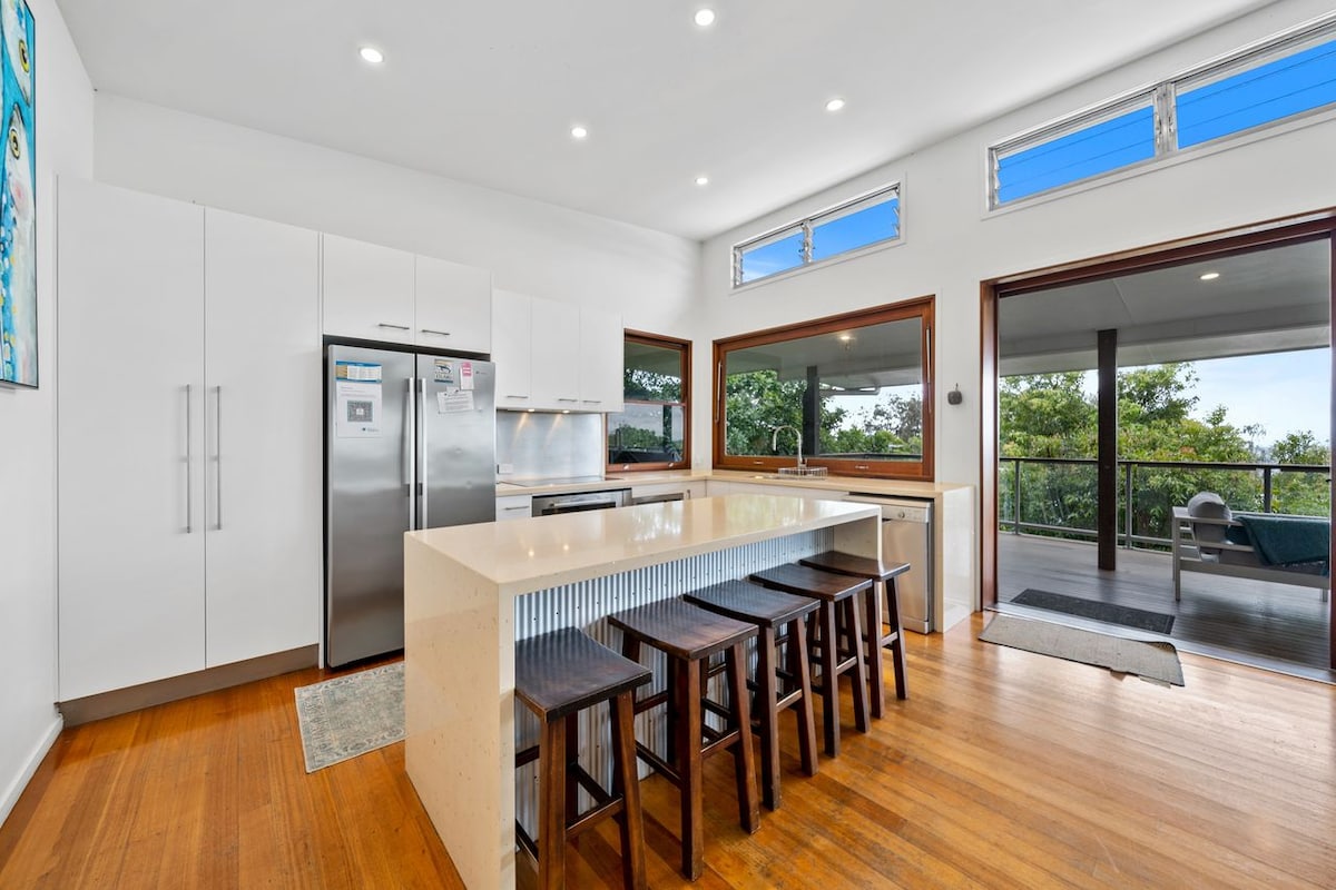Hermosa casa estilo Queenslander restaurada que cuenta con dormitorios extragrandes, techos altos, un baño de lujo, cocina totalmente equipada, impresionante salón con chimenea y una terraza con vistas a una tranquila calle arbolada. A pocos pasos de la estación de Eagle Junction, a 4 paradas del centro de Brisbane. A 10 minutos del aeropuerto. Camina hasta cafés y restaurantes increíbles. A menos de 5 minutos a pie del pintoresco arroyo Cedrón, donde encontrarás rutas para caminar y montar en bicicleta y espacios abiertos. Bicicletas disponibles para que las uses.
