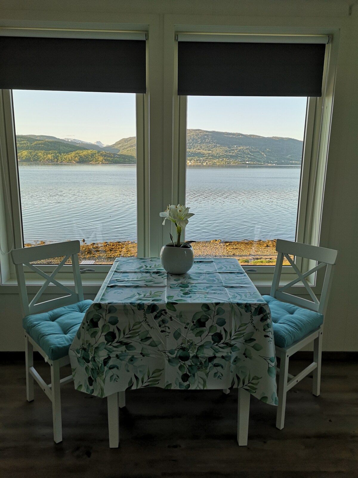 Lad batteriene på dette unike og rolige overnattingsstedet. Du disponerer 2.etasje i vertens bolig, verter 1.etasje. Her disponerer du stort soverom med dobbelseng, eget bad, eget kjøkken og stue med tv. Gjestene disponerer egen veranda med sjøutsikt. Gjester deler felles gang med verter. Det er åpen løsning mellom felles gang og stue til gjestene. Det vil også være mulighet til å benytte seg av vertens vaskemaskin etter avtale.