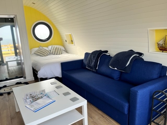 Glamping familiar en una cápsula de lujo con vistas al mar que tiene una cama doble, un sofá cama de 3 plazas adecuado para que 2 personas duerman cómodamente y una habitación húmeda. La cápsula es de doble acristalamiento, totalmente aislada y con gas con calefacción central, con microondas, placa de gas y nevera. Artesanal construida por el principal fabricante de cápsulas con especificaciones a medida, la cápsula tiene una entrada privada y una vista ininterrumpida al mar con un comedor cubierto al aire libre y una bañera de hidromasaje privada.